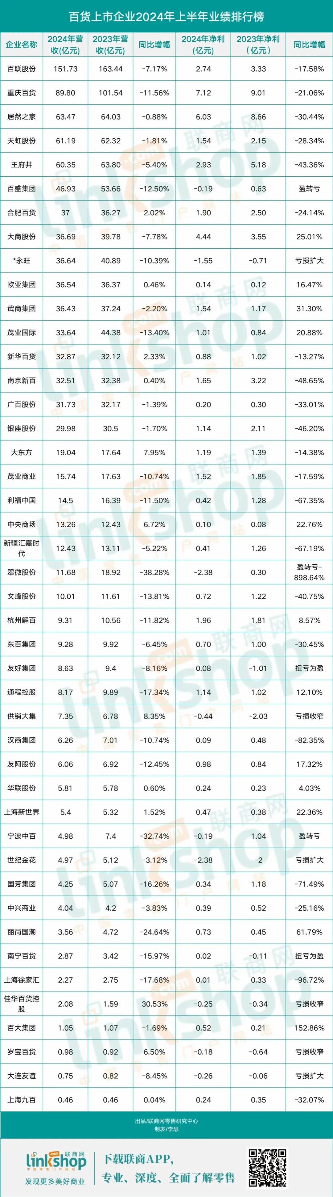 附:2024年上半年百貨上市公司業(yè)績(jī)排行榜