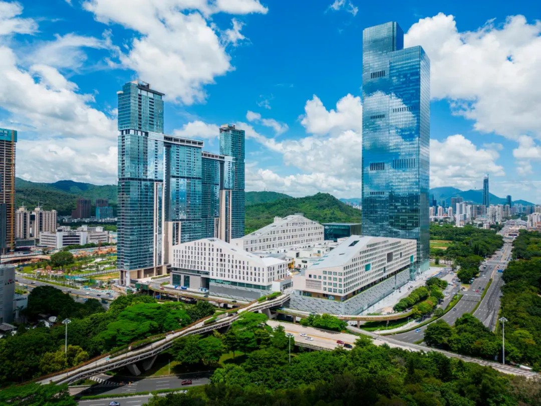 深業(yè)上城在規(guī)劃之初,深業(yè)集團就以“縫合城市”的理念,項目在屋頂打造特色慢行街區(qū),又設(shè)計兩座長達700米高架景觀連廊連接公園,形成了全長1公里的空中慢行系統(tǒng),將綠色生態(tài)引入項目。